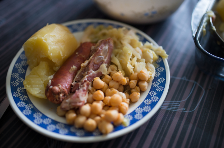 Más contundente, con garbanzos en vez de alubias y un rotundo inventario de carnes — de ternera, pollo y cerdo— hay una variante de cocido unido a la fiesta del Entroido (Carnaval) que es la estrella del invierno en algunos pueblos del interior de Galicia.