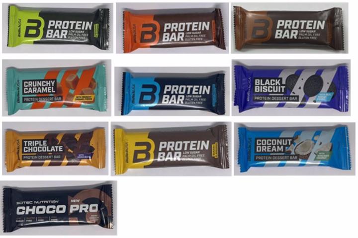 Los productos involucrados son 'Protein Bar pisztácia Angol Nevek' de 70 gramos, con número de lote 1284729 y fecha de caducidad 10/01/2026; 'Protein Bar banana' de 70g, con número de lote 1281206 y fecha de caducidad 10/01/2026; 'Choco Pro 50 g double chocolate' de 50g, con número de lote 1287587 y fecha de caducidad 27/01/2026; 'Protein Dessert Bar 50 g Black Biscuit', con número de lote 1287589 y fecha de caducidad 23/01/2026; 'Protein Dessert Bar 50 g Crunchy Caramel', con número de lote 1287588 y fecha de caducidad 27/01/2026.
