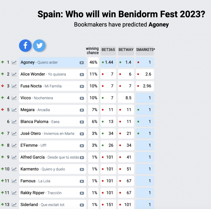 Las casas de apuestas también la avalan como potencial finalista. A 1 de febrero, se colocaba como líder entre los aspirantes de la segunda semifinal. Blanca Paloma, José Otero y E'Femme serían los siguientes favoritos.