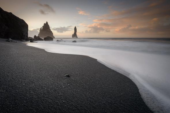 Ese color oscuro tan característico tiene su explicación en el origen volcánico del lugar: la playa está compuesta por restos de lava solidificada y cenizas procedentes de antiguas erupciones del cercano volcán Katla.