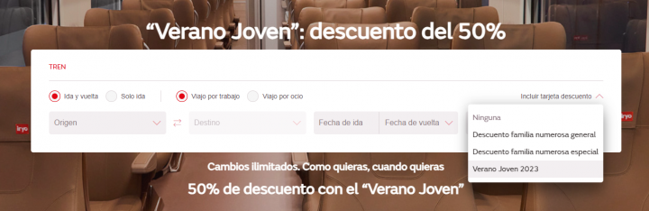 Para aprovechar el descuento en Iryo el procedimiento es diferente. Habrá que acceder al buscador de billetes de la página principal y en el desplegable 'Incluir tarjeta descuento' habrá que seleccionar la opción 'Verano Joven 2023'.