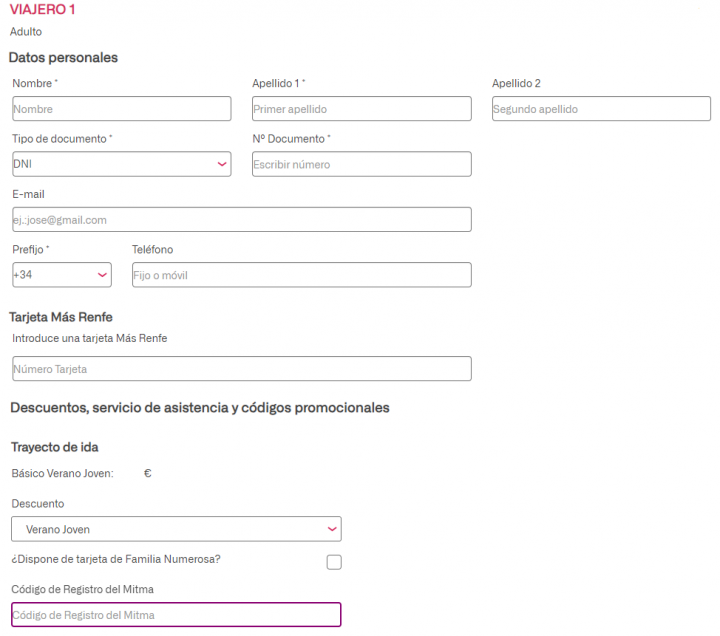 En la sección de 'Descuentos, servicios de asistencia y códigos promocionales' hay que seleccionar en el desplegable la opción Verano joven y rellenar el campo con el código personal de registro del MITMA. A continuación, el precio del billete se actualizará automáticamente y se podrá proceder al pago.