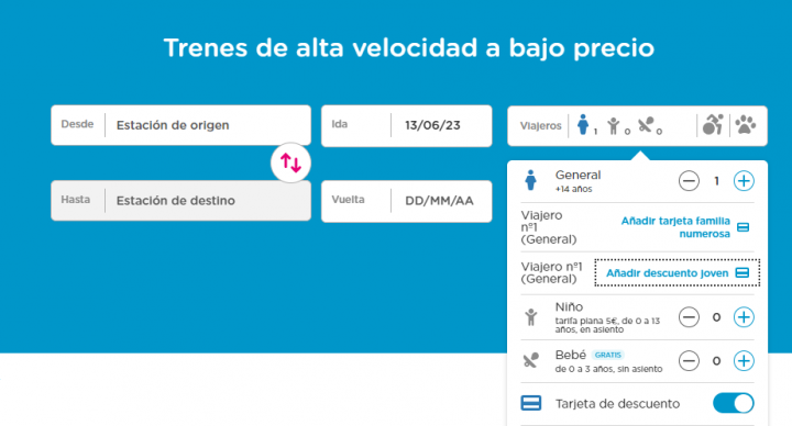 Una vez que ya se haya seleccionado el descuento, solo será necesario indicar estación de origen y destino y las fechas elegidas. Los trenes aparecerán con los precios en los que ya se incluye el descuento joven. Después solo será necesario rellenar los datos personales y pagar.