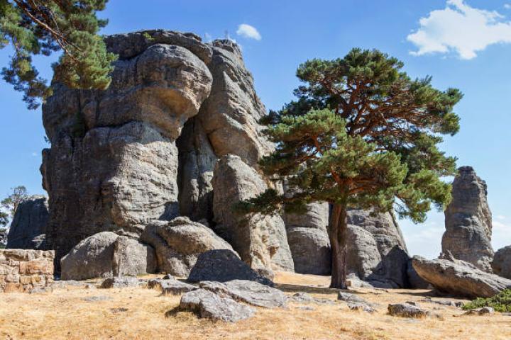Enclavado a 1.200 metros de altitud en el término municipal de Duruelo de la Sierra, se alza un entorno que sorprende al visitante con un paisaje geológico de ensueño: rocas de cuarcitas y areniscas moldeadas como si el mismísimo Salvador Dalí las hubiera diseñado, con hongos pétreos de hasta quince metros, columnas aparentemente imposibles y arcos naturales que desafían la lógica y la gravedad.