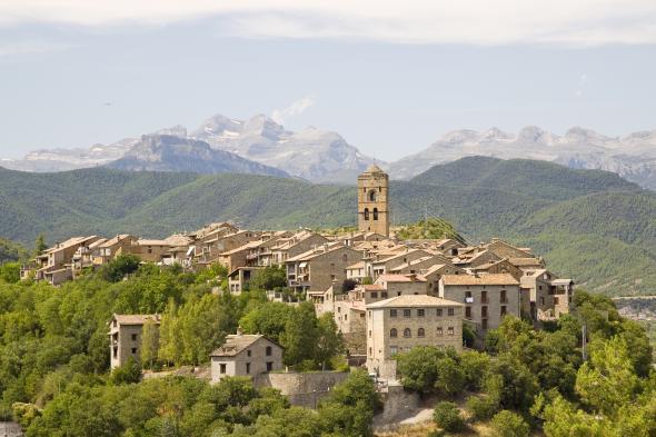 Se ubica en la comarca de Sobrarbe, en la provincia de Huesca (Aragón) y es conocido por tener un centro histórico declarado Conjunto Histórico-Artístico, donde se puede ver la convergencia de la arquitectura románica, gótica y renacentista. Sus impresionantes edificaciones medievales y su impotente entorno natural lo han llevado a formar parte de la exclusiva lista de Los Pueblos más Bonitos de España.