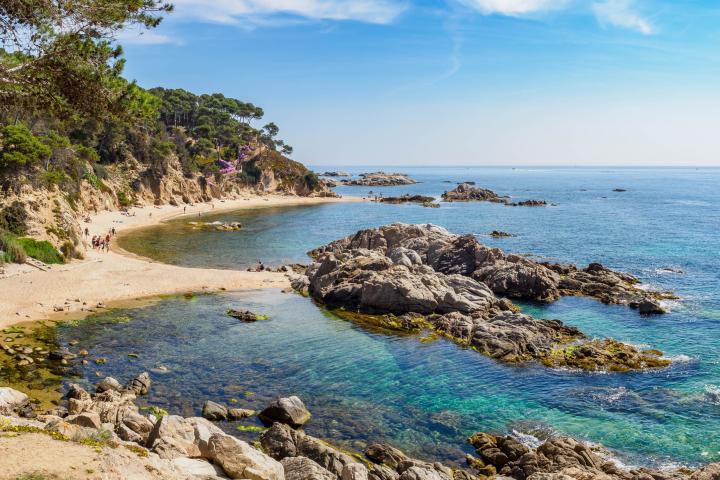 En esta pequeña playa rodeada de pinos se puede disfrutar del paisaje típico de la Costa Brava.