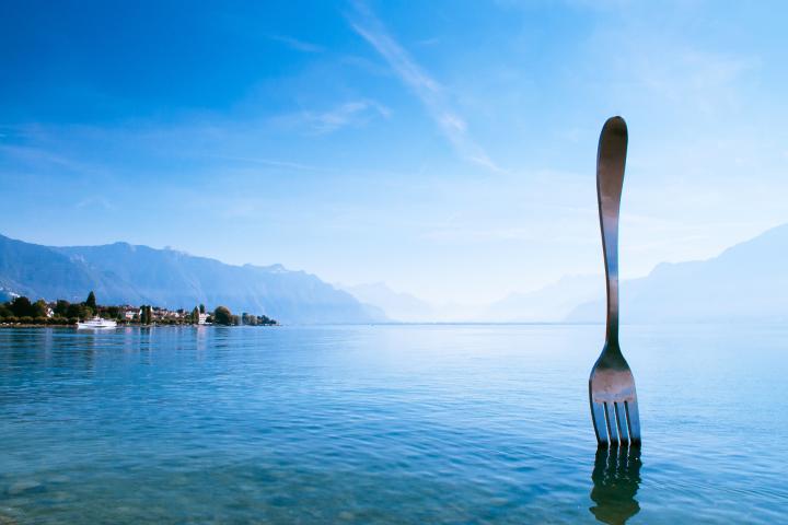 En la tranquila y pintoresca ciudad suiza de Vevey, junto al paseo del Quai Perdonnet, se encuentra una obra que a primera vista resulta desconcertante pero icónica: un tenedor gigante clavado en las aguas del Lago Lemán.
