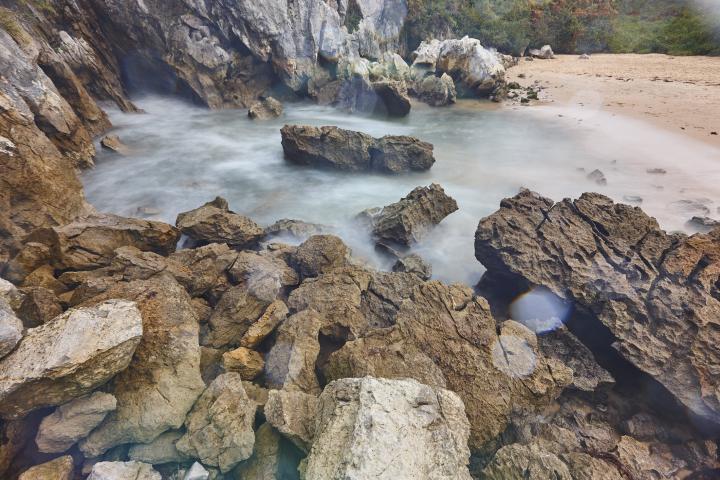 Estamos hablando de la playa de Gulpiyuri, una joya geológica e interior que redefine el concepto clásico de litoral, cuyo nombre significa “círculo de agua”. A apenas 100 metros de la costa, en pleno concejo de Llanes, se abre paso un pequeño arenal de unos 40 metros de longitud cuya existencia se debe al colapso de las aguas del Cantábrico con las rocas kársticas, hasta el punto de crear una cueva cuyo techo colapsó y creo esta depresión.
