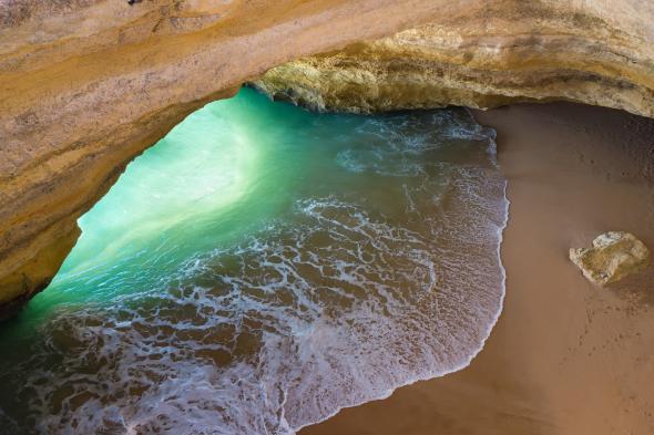 Se trata de Algar de Benagil, en el Algarve portugués. Este paradisiaco rincón es uno de los reclamos turísticos más famosos de la zona y su fama la ha ganado a pulso con su belleza natural, puesto que es una playa metida en una cueva, y la sensación que da es la de estar enmarcada por una cúpula rocosa.