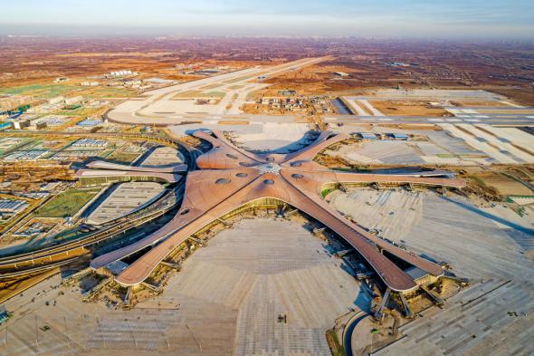 Inaugurado en 2019, el aeropuerto internacional de Daxing se gestó como el nuevo gran hub de Pekín, con capacidad para absorber el tráfico que desborda al viejo Pekín-Capital. La terminal ocupa 700.000 metros cuadrados bajo techo, distribuidos en seis brazos que recuerdan a una estrella de mar y cuenta con 82 puertas de embarque y cinco pistas de aterrizaje: cuatro comerciales y una militar, que se han construido sobre una superficie de 2.679 hectáreas. El presupuesto de construcción ascendió a 80.000 millones de yuanes (10.400 millones de euros) y su silueta futurista, reconocible desde el aire, se convirtió de inmediato en todo un icono arquitectónico.