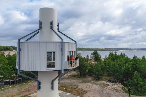 No tiene forma de casa, pero lo será. Ni está junto al mar ni entre bosques, sino en medio de lo que fue una mina de carbón. A 8 metros de altura, en el corazón de Brandeburgo, Alemania, una torre de aerogenerador se ha convertido en la promesa de una nueva vida: la de una casa de vacaciones suspendida entre el pasado industrial y el futuro sostenible.