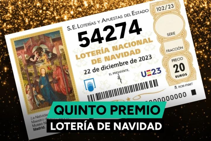 Ya conocemos el primero de los ocho quintos premios del sorteo de la Lotería de Navidad 2023. El número 54.274 ha sido agraciado con un premio de 60.000 euros a la serie, lo que equivale a 6.000 euros para cada décimo.