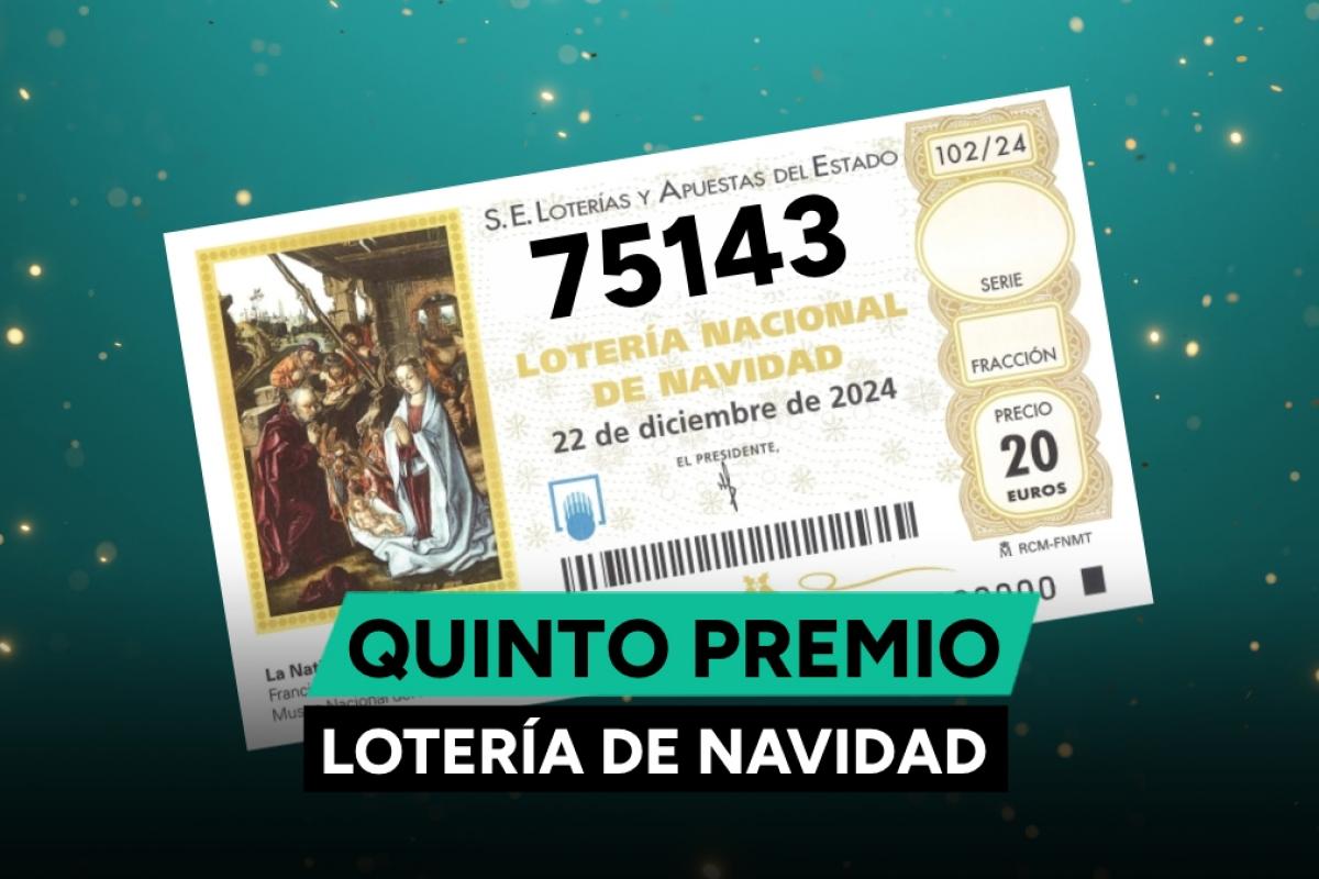 El número 75.143 ha sido premiado con el séptimo quinto premio de la Lotería de Navidad 2024. Los afortunados ganadores recibirán 60.000 euros por serie, es decir, 6.000 euros por décimo.