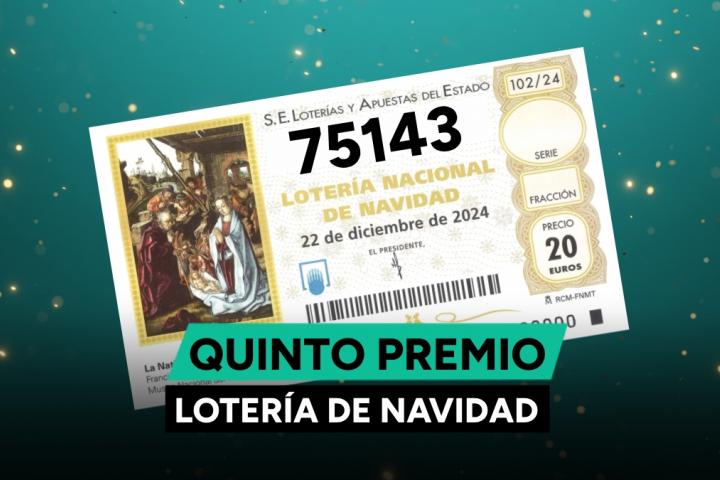 El número 75.143ha sido el séptimo quinto premio de este Sorteo Extraordinario de la Lotería de Navidad 2024, dotado con 60.000 euros por serie, es decir, 6.000 euros por décimo.