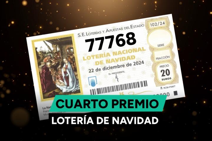 El número 77.768 ha sido el primer cuarto premio del Sorteo Extraordinario de Navidad 2024, dotado con 20.000 euros por décimo, es decir, 200.000 euros por serie. El número fue cantado a las 09.57 horas en el quinto alambre de la segunda tabla.