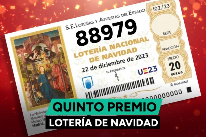 El tercer quinto premio de la Lotería de Navidad 2023 ha sido para el 88.979. Este premio está dotado con 60.000 euros a la serie, es decir, 6.000 euros por décimo.