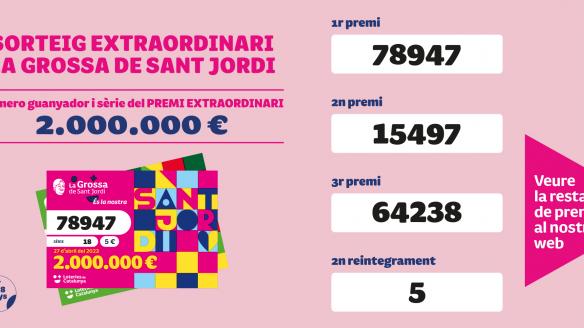 El Premio Extraordinario del Sorteo de la Grossa de Sant Jordi 2023 ha sido para el número 78.947 y la serie 18. Está dotado con 2.000.000€, ¡enhorabuena a los afortunados!