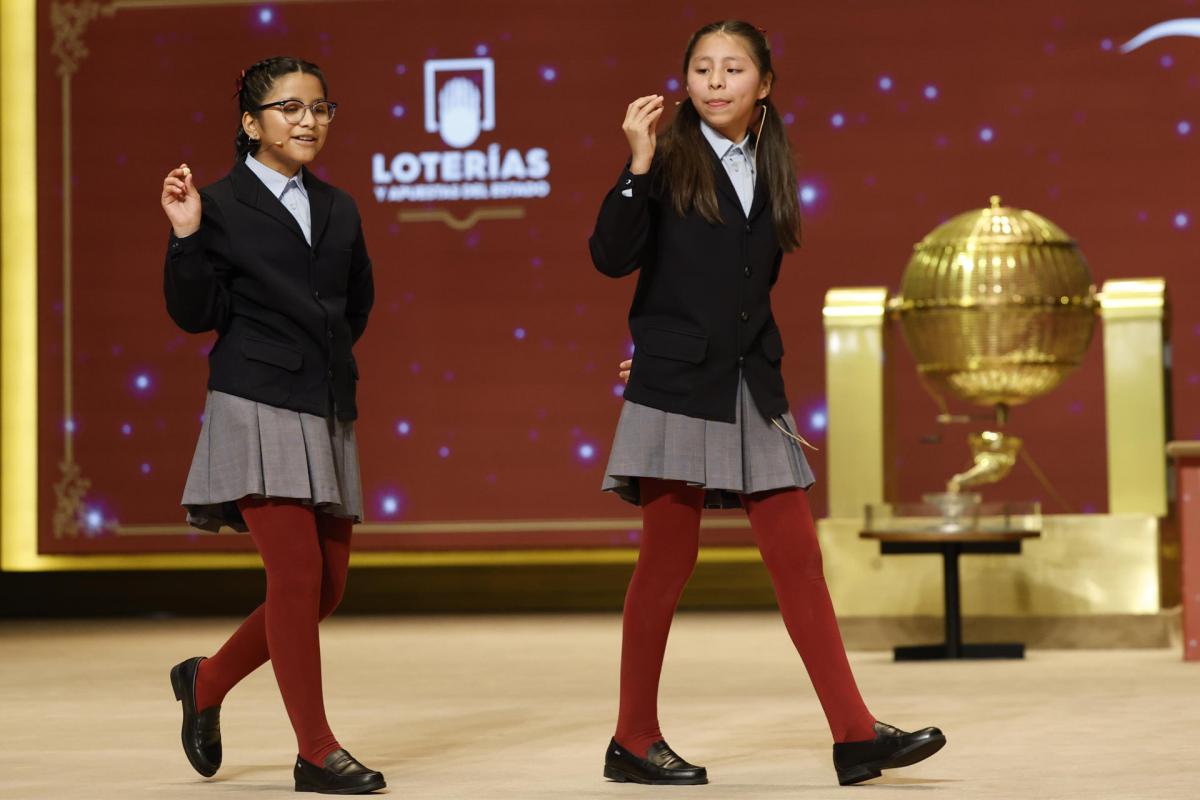 Las niñas de San Ildefonso Alba Yadira Machaca e Italy Andrea Blanco han cantado el esperado primer premio a las 10.44h. horas en el tercer alambre de la cuarta tabla, provocando el aplauso y los gritos de los presentes en la sala.