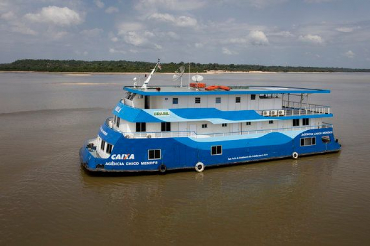 Pero si la sucursal de un banco en un camión parece algo sorprendente, Caixa también cuenta con dos sucursales flotantes. La sucursal Chico Mendes, llamada así por los ecologistas que lucharon por conservar la selva amazónica, es la primera de ellas: equipada con tecnología satelital para ofrecer una conexión segura con la red de datos del banco. Navega por el Amazonas (en un área del tamaño de Gran Bretaña) ofreciendo servicios esenciales a 260.000 personas para que puedan transferir dinero, solicitar microcréditos o acceder a beneficios sociales.