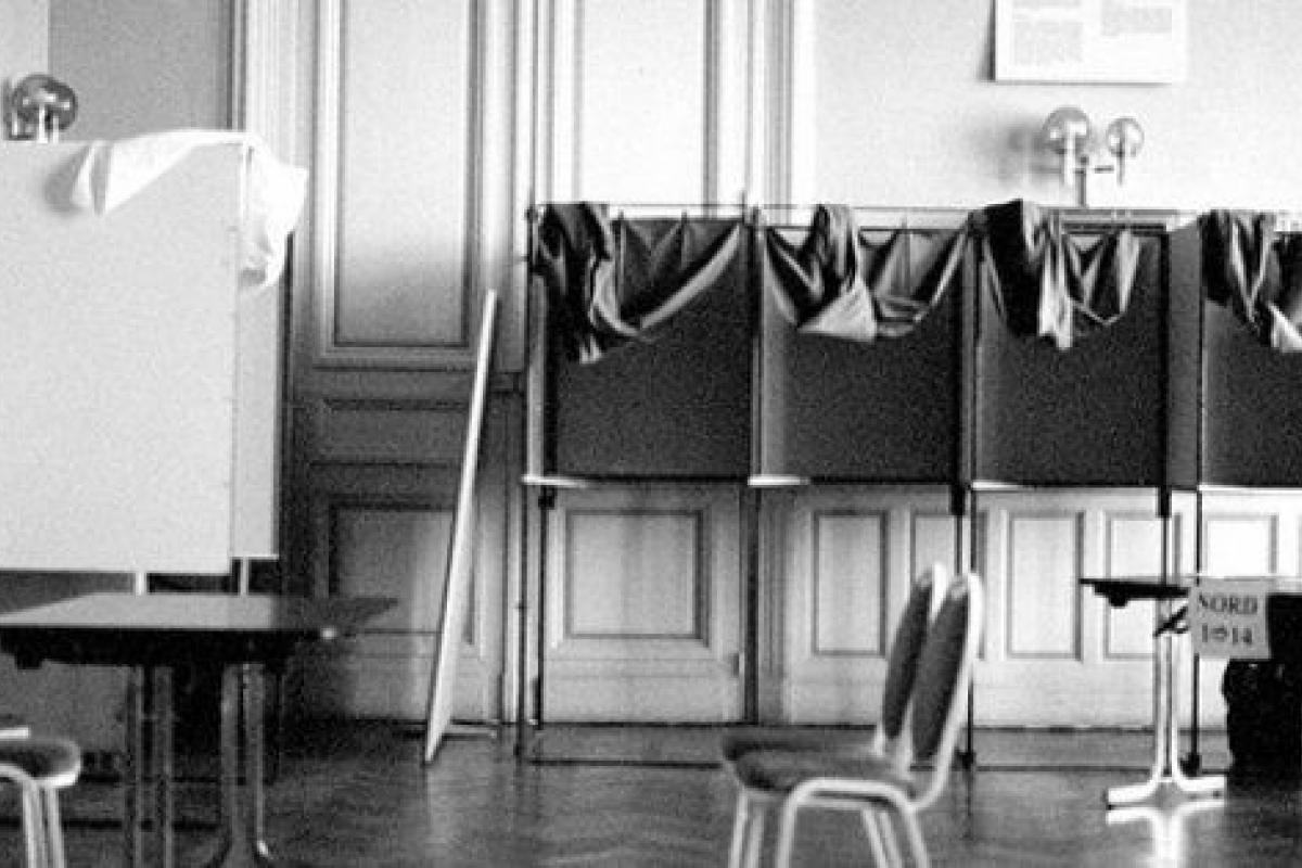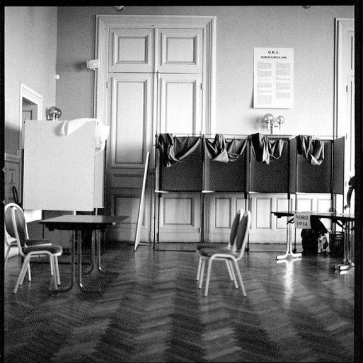 Es el paisaje después de la batalla. Gracias a la escrupulosa defensa de la privacidad del voto, las cabinas en un día electoral francés no son atrezzo, como estamos acostumbrados a ver, sino parte de un ritual obligado que simboliza el carácter privado y sagrado del acto de votar. Emmanuelle Brisson, que acostumbra a fijarse en el detalle sutil , dotada para captar lo inaprensible, se queda en este caso con el espacio sin acción, sin persona, apenas unas sillas descolocadas, un aula vacía, esas cabinas con sus cortinas recogidas y una mano furtiva que se cuela sin querer. No es difícil notar el silencio del momento, y los pasos y palabras susurradas de unos momentos antes. Termina una agotadora campaña. Es la antesala de la celebración del cambio, de la escenificación de la esperanza. El tiempo de la decepción, casi siempre implacable, todavía está lejos. Ahora solo es el momento para la crónica de una victoria esperada.