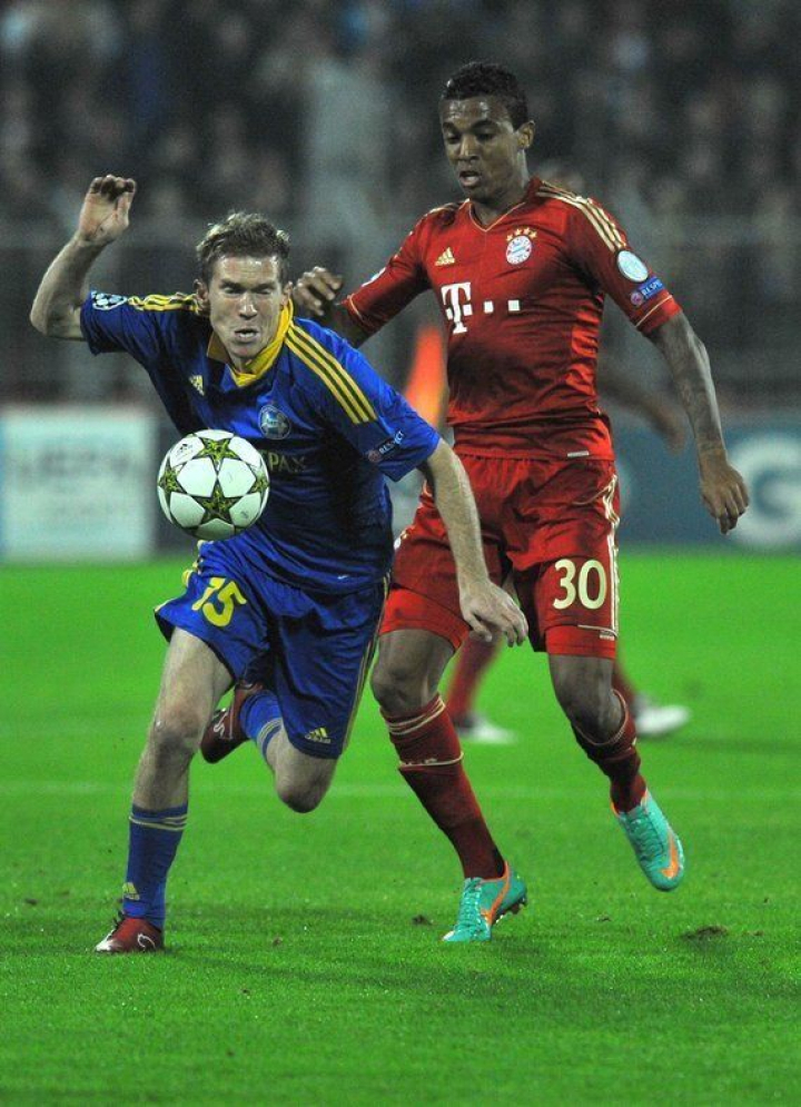 Alexander Hleb (izq) pelea por el balón contra el jugador del Bayern de Munich Luiz Gustavo (dcha) el pasado 2 de octubre. Foto: VIKTOR DRACHEV / AFP.