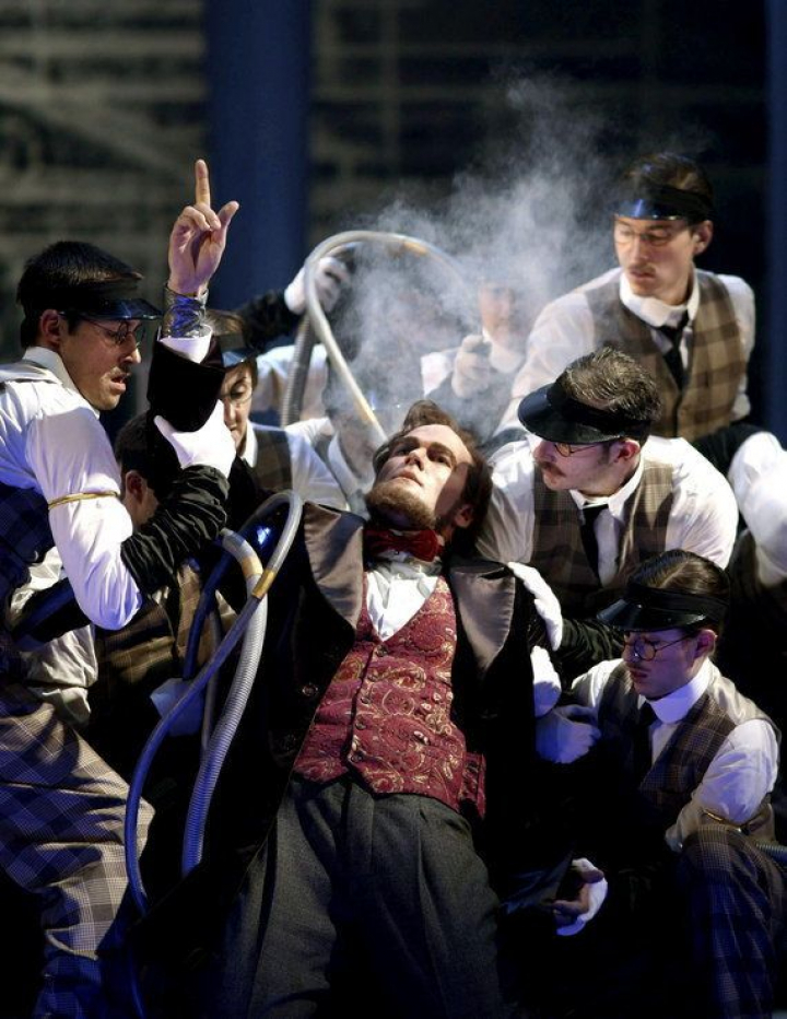 El espectáculo se apoya en unos pilares muy sólidos. Para empezar la novella de Peter Stephan Jungk, recientemente publicada por Turner Noema, y que recomiendo a cualquiera que alguna vez haya sospechado que el creador de Blancanieves tenía un lado menos colorido y encantador; o sea, a todo el mundo. Lamentablemente, la ópera deja fuera algunos episodios interesantes como la performance sangrienta que le dedica el extrabajador obsesionado con vengarse, pero mantiene el espíritu general, la mayor parte de la narración, incluidos algunos pasajes fascinantes como la aparición de la niña disfrazada de búho que no sabe quién es Disney, lo que saca de quicio a papá Walt; o una inefable conversación de éste con un autómata de Lincoln que el autor aprovecha para especular, sin demasiada sutileza, sobre las tendencias políticas del fabricante de sueños.