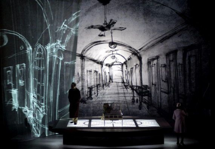 El espacio escénico de Dan Potra es tan atractivo que podría ser una obra en sí mismo. Uno siente el deseo de entrar en ese espacio cilíndrico que delimita la maquinaria mastodóntica de la que cuelgan dos proyectores disfrazados de cámaras cuya silueta recuerda la cabeza de Mickey Mouse y que proyectan animaciones monocromas y siniestras sobre telas que caen y luego arrancan los actores, y que giran al mismo tiempo que aquellas. Una instalación espectacular que me habría encantado habitar unos instantes.