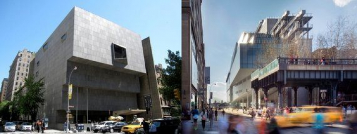 El edificio de Marcel Breuer, inaugurado en 1966, es un búnker de roca ígnea, áspero en sus superficies y proporciones. Un cíclope amenazante y refractario con la arquitectura del entorno. El de Breuer fue un diseño coherente con aquella idea anacrónica y romántica del Whitney como fuerte y refugio del arte estadounidense, particularmente del que crecía en Manhattan al abrigo de Gertrude Vanderbilt Whitney, y que era ignorado, e incluso despreciado, por grandes instituciones como el enciclopédico MET y el eurocéntrico MoMA. El Whitney del año 2015, a cinco kilómetros de distancia, flanqueado de cerca por el río Hudson y el High Line Park, es la más completa antítesis de la vieja sede.