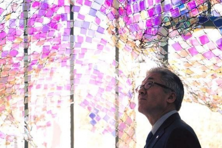 Kim Jongdeok, ministro de Cultura, Deportes y Turismo de la República de Corea, bajo la ondulante escultura de Soo Sunny Park