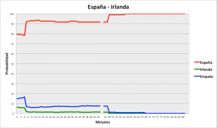 Como se ve, desde que Silva marca el 2-0, el mercado de apuestas asigna una probabilidad prácticamente del 100% a la victoria de España. Tanto el empate como la victoria de Irlanda se convierten en resultados prácticamente imposibles. Los 45 minutos adicionales únicamente han servido para recrearse en el juego de la selección española, soñar con otro título, admirar los intentos los jugadores irlandeses y los cánticos de sus hinchas.