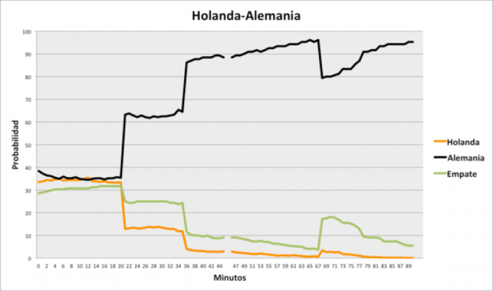 En el minuto 50 Alemania tenía el mismo resultado a favor que España. Pero será porque Alemania no es España, será porque Holanda no es Irlanda, el 2-0 frente a Holanda en el minuto 50 le otorgaba a Alemania una probabilidad de ganar del 90% mientras la probabilidad de ganar de España frente a Irlanda en el minuto 50 y con el mismo resultado a favor era prácticamente del 100%.
