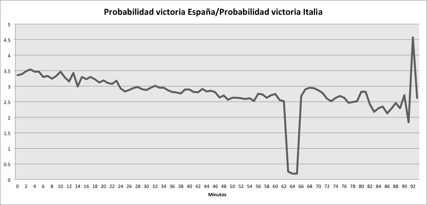 El siguiente gráfico ayuda a comprender un poco mejor la historia del partido. En él se representa el ratio de las probabilidades de victoria de España e Italia.
