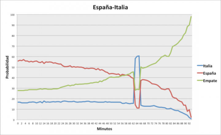 Como se ve en el gráfico, España era claramente la favorita al empezar el partido, con una probabilidad de victoria cercana al 56%, frente a un 17% para Italia y a un 27% para el empate. Según pasan los minutos, la probabilidad de que España gane el partido disminuye, como es inevitable, ya que quedan menos minutos para que el resultado cambie. La probabilidad de que gane Italia, también disminuye, pero menos; quizás Italia demuestra estar un poco mejor de lo que se pensaba. Según pasan los minutos, lo único que aumenta es la probabilidad de que el partido termine en empate.