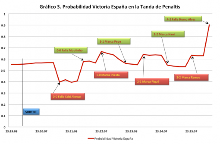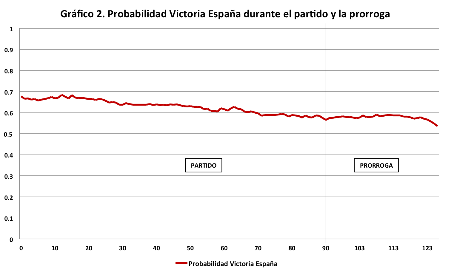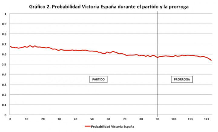 Al principio del encuentro esta probabilidad es de casi el 70%, pero baja progresivamente a lo largo del partido hasta situarse en un 55% al final de la prórroga. Esto probablemente refleja el hecho que se hace cada vez más probable de una tanda de penaltis en la que la ventaja de España sería menor.