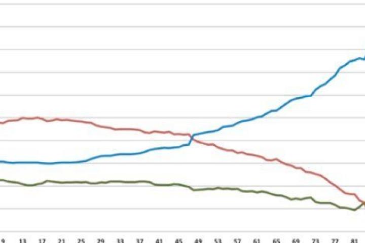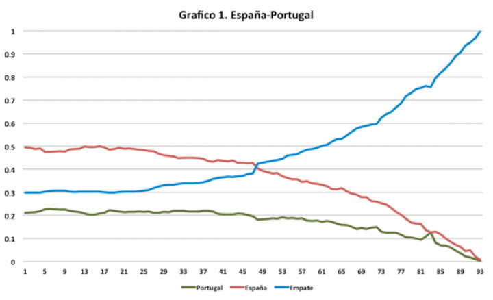 En el gráfico 1 reproducimos las evolución a lo largo de los 90 minutos del partido de las probabilidades de cada uno de los tres resultados posibles (victoria para España, empate, victoria para Portugal). Como es obvio la probabilidad de empate aumenta a medida que transcurre el partido sin goles. Se ve también que España mantiene una considerable ventaja con respecto a Portugal de resolver el partido en los 90 minutos.