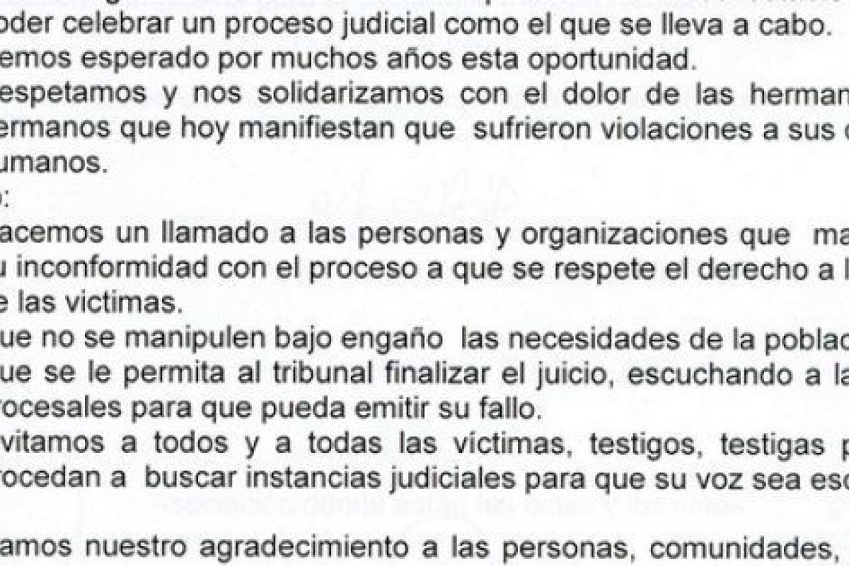 A todas ellas les envío hoy, muy especialmente, mi admiración, mi agradecimiento por su trabajo y por su lucha. Les envío mi cariño, mi recuerdo y mi esperanza de que este hito histórico sea el primero en la lucha por la justicia en Guatemala. Una condena de 80 años a un exdictador de 86 puede ser poco más que un gesto simbólico. Pero será un símbolo de que ellas pueden empezar a superar ese "temor a la vida" que les ha causado la impunidad durante más de 30 años.