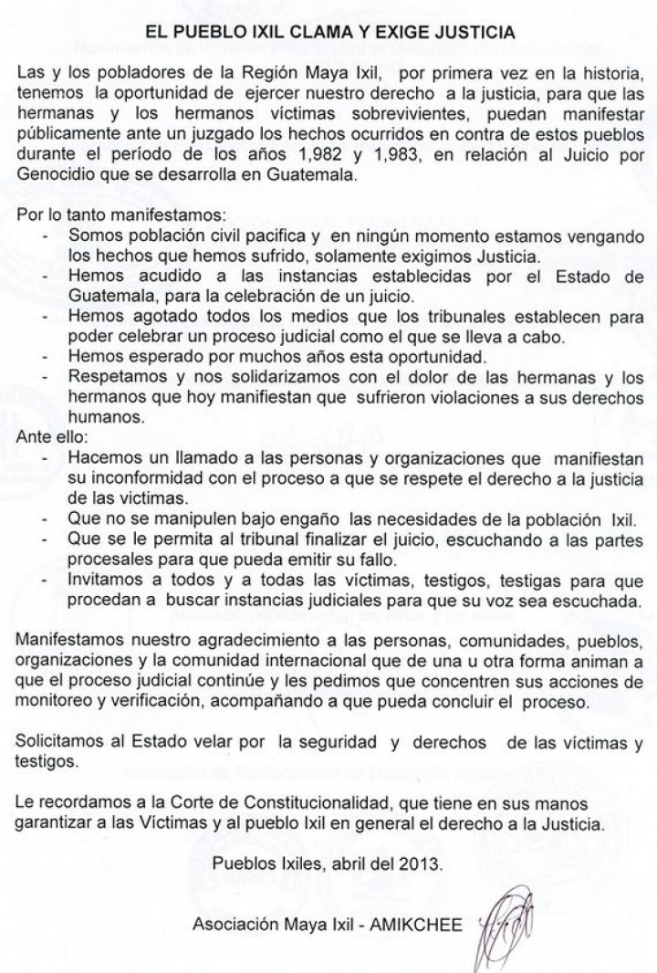 Comunicado del pueblo Ixil (pulsa para verlo completo). Foto: AMIKCHEE.