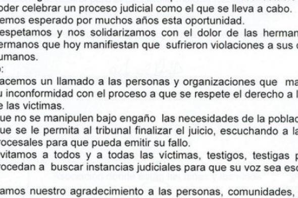 A todas ellas les envío hoy, muy especialmente, mi admiración, mi agradecimiento por su trabajo y por su lucha. Les envío mi cariño, mi recuerdo y mi esperanza de que este hito histórico sea el primero en la lucha por la justicia en Guatemala. Una condena de 80 años a un exdictador de 86 puede ser poco más que un gesto simbólico. Pero será un símbolo de que ellas pueden empezar a superar ese "temor a la vida" que les ha causado la impunidad durante más de 30 años.
