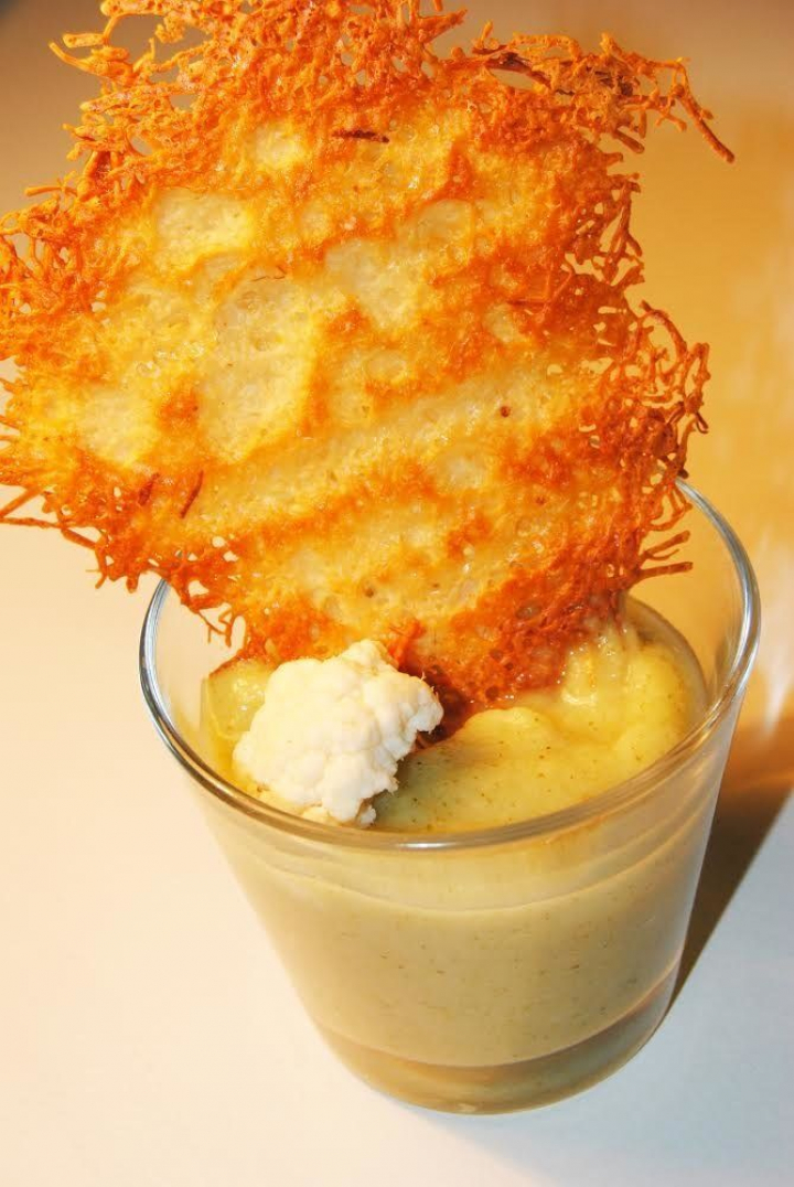Sirve la crema caliente en cuatro tazas de consomé y coloca encima un crujiente de queso y un miniramito de coliflor cocida. Una sugerencia: junto a las flores de otoño cocidas, tritura ocho espárragos trigueros previamente cocidos, la combinación es muy acertada.