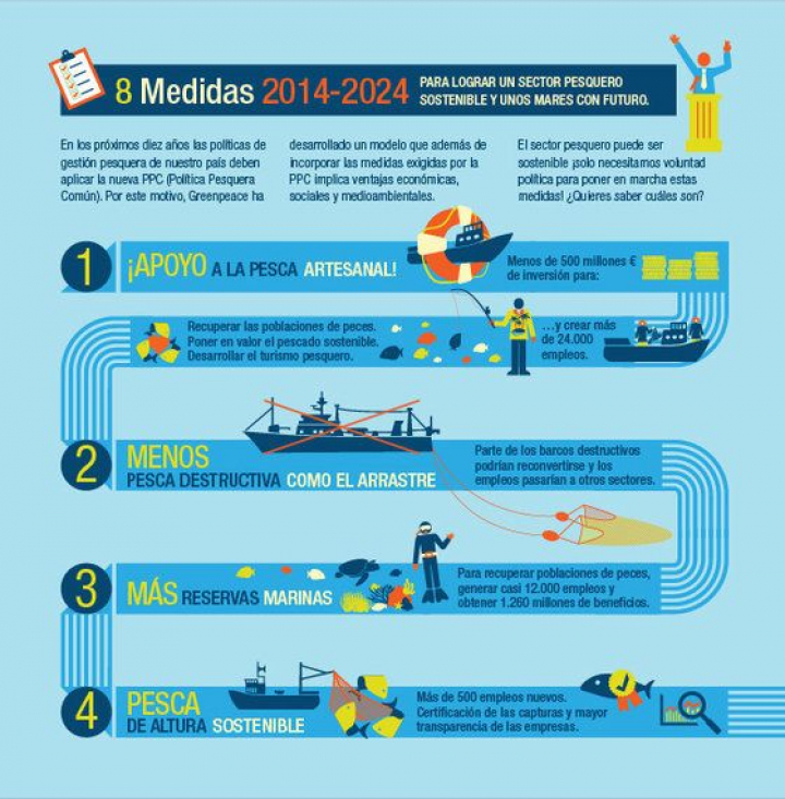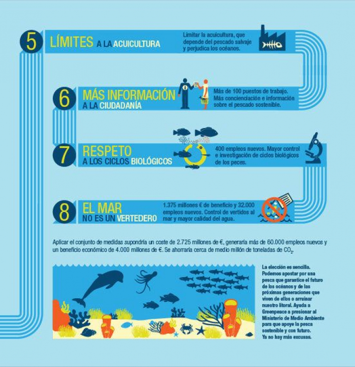 En el informe Empleo a bordo. Impacto socio-económico de un modelo pesquero sostenibleelaborado por Greenpeace se propone un sistema de gestión pesquera que beneficia al medio marino y al conjunto de la sociedad. Este modelo permitiría la recuperación de las poblaciones de peces; la generación de empleo estable; la fijación de población rural; revertiría la tendencia del sector pesquero mediante la creación de 60.000 empleos netos; proporcionaría un beneficio económico de 4.000 millones de euros en una década y por último ahorraría la emisión de medio millón de toneladas de CO2.