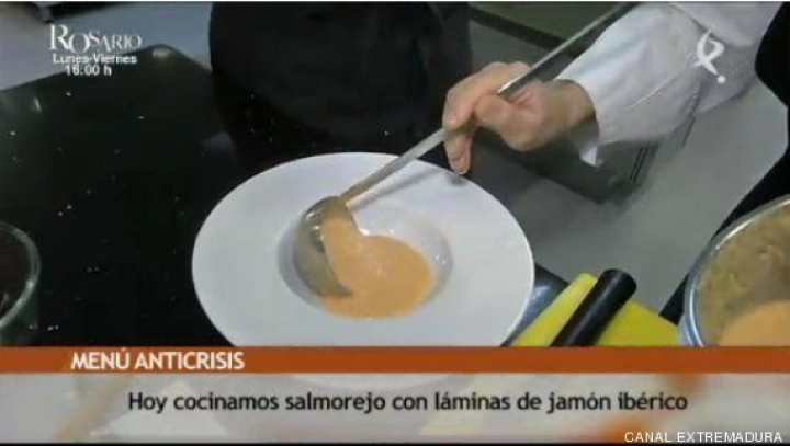 - Conexión en directo con un cocinero que nos presenta el menú anticrisis: hoy vamos a hacer gazpacho y salmorejo, dice la reportera, que también parece mega feliz. "Con NUESTROS tomates, y NUESTRO jamón", remarcan varias veces. "Vaya pinta", dice fingiendo cierta envidia la presentadora, mientras la reportera prueba el plato.