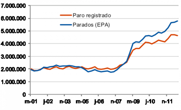 Estos últimos no tienen necesariamente que ser los mismos que el número de afiliados a la Seguridad Social (registro del Ministerio), puesto que es posible, más allá de consideraciones legales, estar trabajando y no cotizar. En relación con las personas en situación de paro, podríamos considerar la estimación de la EPA como más realista en la medida en que incorpora a individuos que, aunque no estén inscritos en las oficinas del INEM, se encuentran efectivamente en situación de búsqueda activa de un puesto de trabajo.