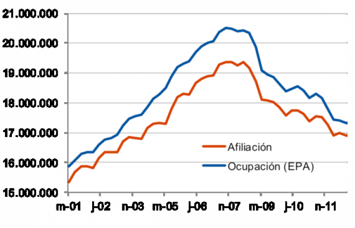 Aunque distintas, ambas fuentes de información coinciden al describir el proceso de acusada destrucción de empleo que ha tenido lugar en nuestro país desde el inicio de la crisis. Correcciones de casi 2,5 millones de personas en la afiliación y de algo más de tres millones en la ocupación desde los niveles anteriores a la crisis, o repuntes en el número de parados de similar magnitud, como se observa en los gráficos, no tienen parangón en ninguna de las economías de nuestro entorno. El empleo perdido seguramente no se recuperará con rapidez. A España le costó tres años, desde 2003 a 2006, generar tres millones de puestos de trabajo, y eso en un momento del ciclo económico mucho más favorable que el actual, en el que la recaída de la actividad y la necesidad de reducir el déficit público lastran cualquier expectativa de mejora del empleo a corto plazo.