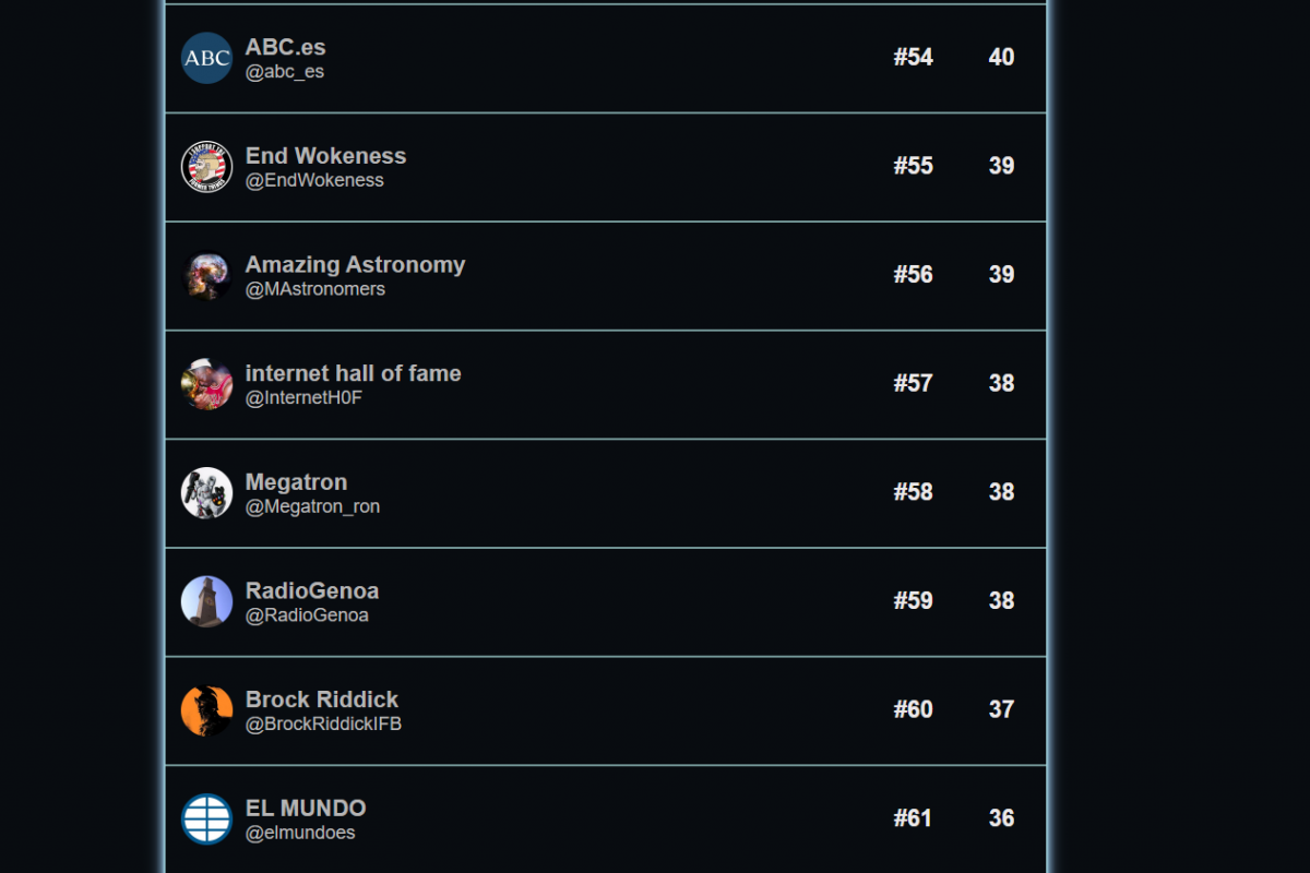Más allá de los medios de comunicación mencionados, en la clasificación se encuentran otros como el influencer de extrema derecha Jackson Hinkle, el medio de noticias virales Daily Loud, el propio Elon Musk y españoles 'agitadores' de la ultraderecha como Vito Quiles y Wall Street Wolverine.