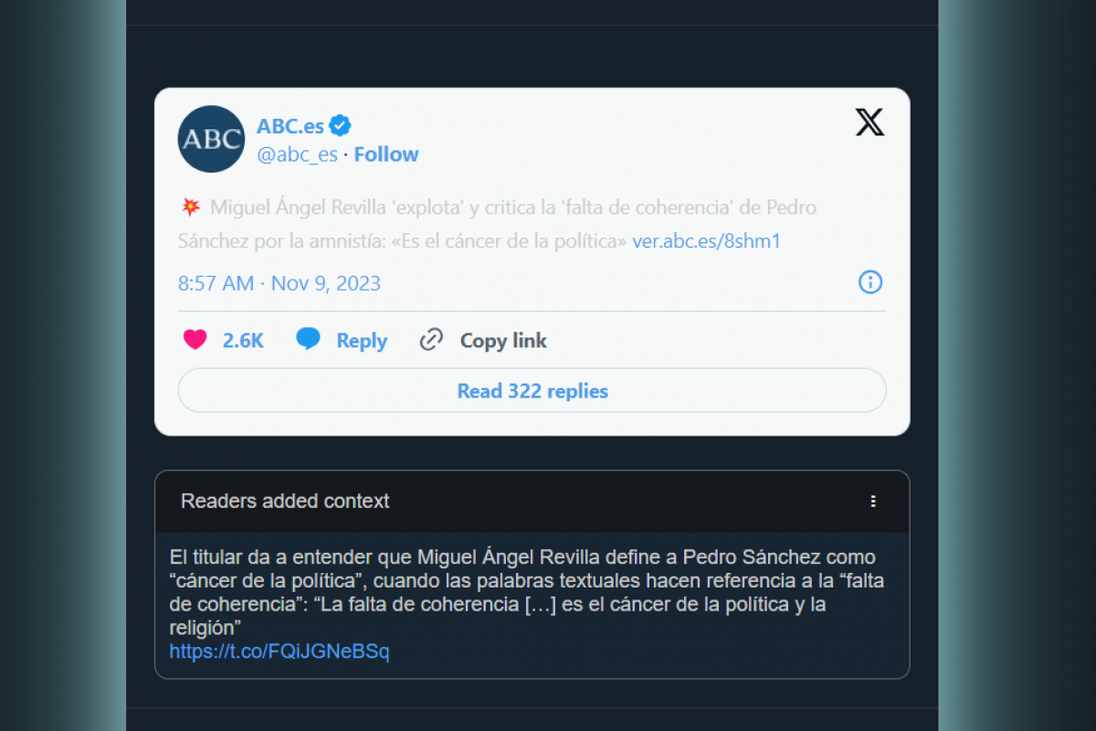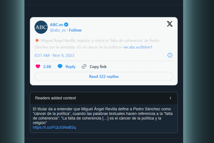 ABC y El Mundo han empezado el 2024 coronándose como los dos diarios nacionales más corregidos por la comunidad mundial de X (antes Twitter). Así lo recoge la primera clasificación masiva elaborada por un usuario de la red social a partir de las 'correcciones' que han ido acumulando a nivel internacional los diferentes usuarios de la plataforma.
