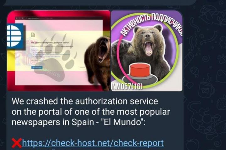 El periódico El Mundo fue el que sufrió las peores consecuencias. En su caso los hackers empezaron a atacar sobre todo la parte de login, es decir, donde los usuarios se autentifican para entrar a leer y comentar las noticias. Esa página quedó bloqueada. “Con los demás no lo consiguieron, pero El Mundo sí lograron que cayera. Le atacaron con todo y consiguieron encontrarle un punto débil”. A las 12:49 los atacantes fardaron de la victoria en su canal de Telegram: “Hemos colapsado el servicio de autorización del portal de uno de los periódicos más populares de España”, escribían junto a la captura de pantalla de la web bloqueada con marca de agua y acompañada de su característico oso pardo rugiendo.
