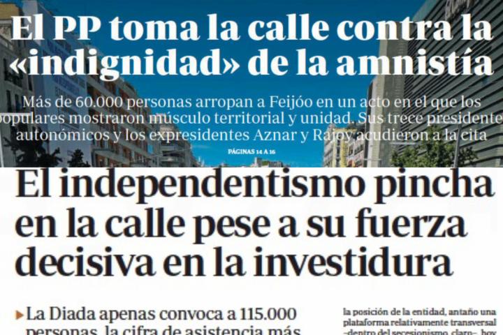 Los mismos periódicos que tildaron de "pinchazo" una Diada con 115.000 asistentes celebran ahora el "clamor multitudinario" de 40.000 ciudadanos contra la amnistía