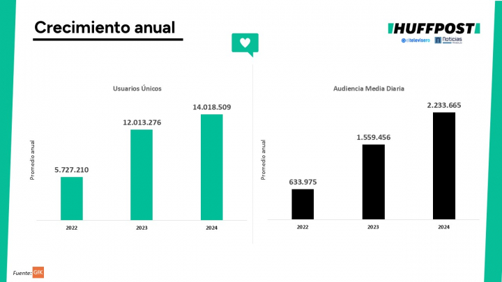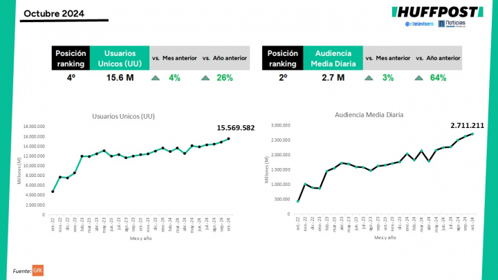 Este mes de octubre de 2024 también ha marcado un punto de inflexión en lo que a la cifra total de usuarios únicos que han pasado por el diario se refiere. Según los datos del medidor, más de 15,5 millones de lectores se informaron a través de ‘El HuffPost’ en octubre, un dato que ha hecho ascender a la cabecera a la cuarta posición del ranking de los más leídos de España. Este resultado supone un crecimiento del 26% respecto al mismo periodo de 2023, donde ya registraba algo más de 12 millones de fieles mensualmente.