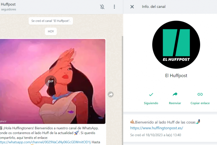 Para sumarte a nuestro canal lo único que tiene que hacer es buscarnos en la propia app. El HuffPost es un usuario verificado, por lo que podrás identificarlo por el check verde que aparece junto a su nombre. Cada vez que compartamos una noticia, un vídeo o un enlace en nuestro canal de WhatsApp llegará a su teléfono una notificación en tu teléfono móvil como si de otro mensaje cualquiera se tratara. En este sentido, al igual que ocurre con el resto de chats, dichas notificaciones pueden silenciarse si así lo desea.