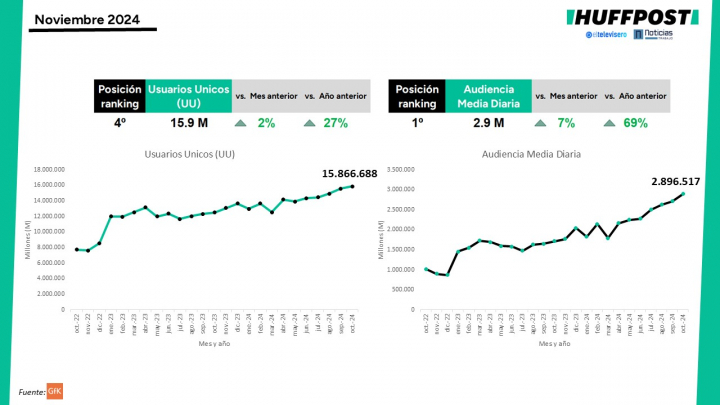 Este mes de noviembre de 2024 también ha marcado un punto de inflexión en lo que a la cifra total de usuarios únicos que han pasado por el diario se refiere. Según los datos del medidor, más de 15,8 millones de lectores se informaron a través de El HuffPost en noviembre, un dato que ha hecho ascender a la cabecera a la cuarta posición del ranking de los más leídos de España. Este resultado supone un crecimiento del 27% respecto al mismo periodo de 2023, donde ya registraba algo más de 12 millones de fieles mensualmente.